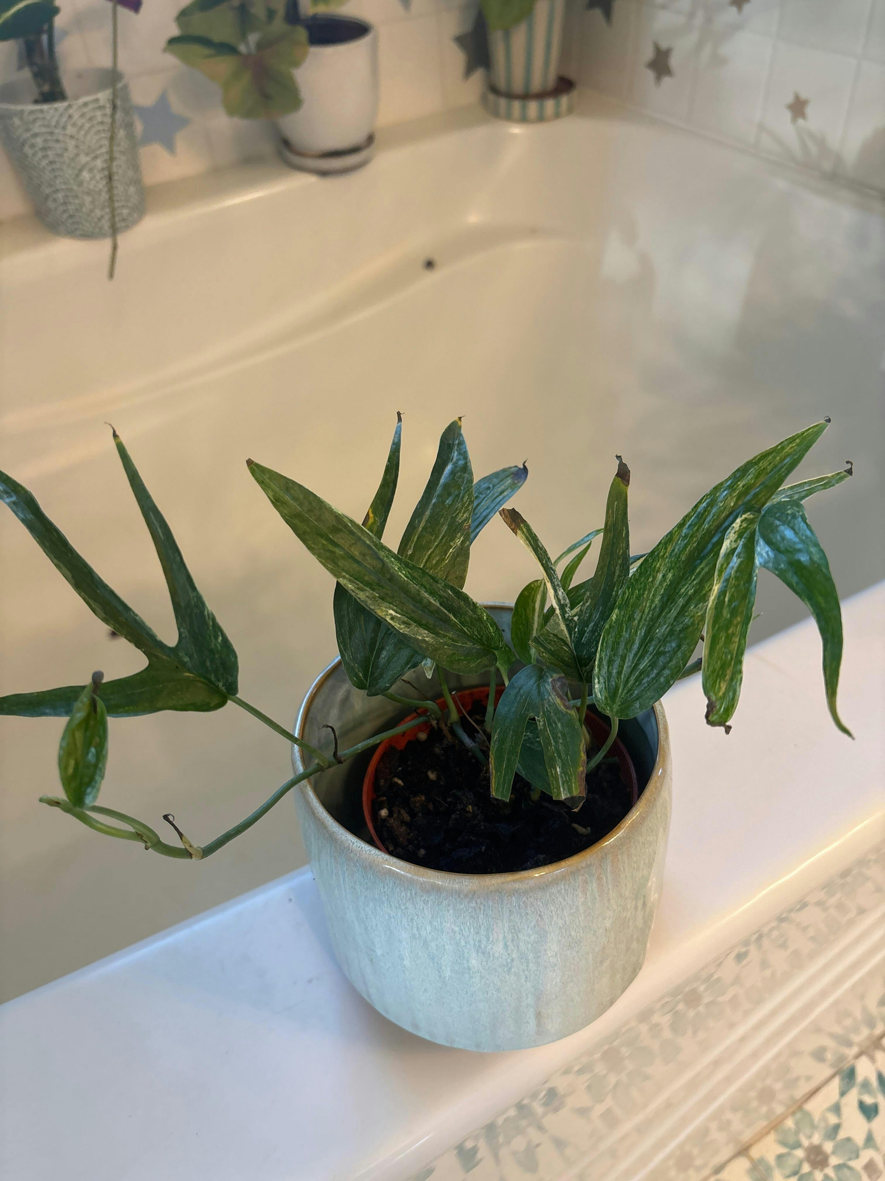 This plant prefers a well draining soil that is rich in organic matter. Allow your plant to dry out about halfway between watering, taking care to not allow it to sit in excess water. Provide your plant with bright indirect light and something to climb to avoid it putting out leafless runners