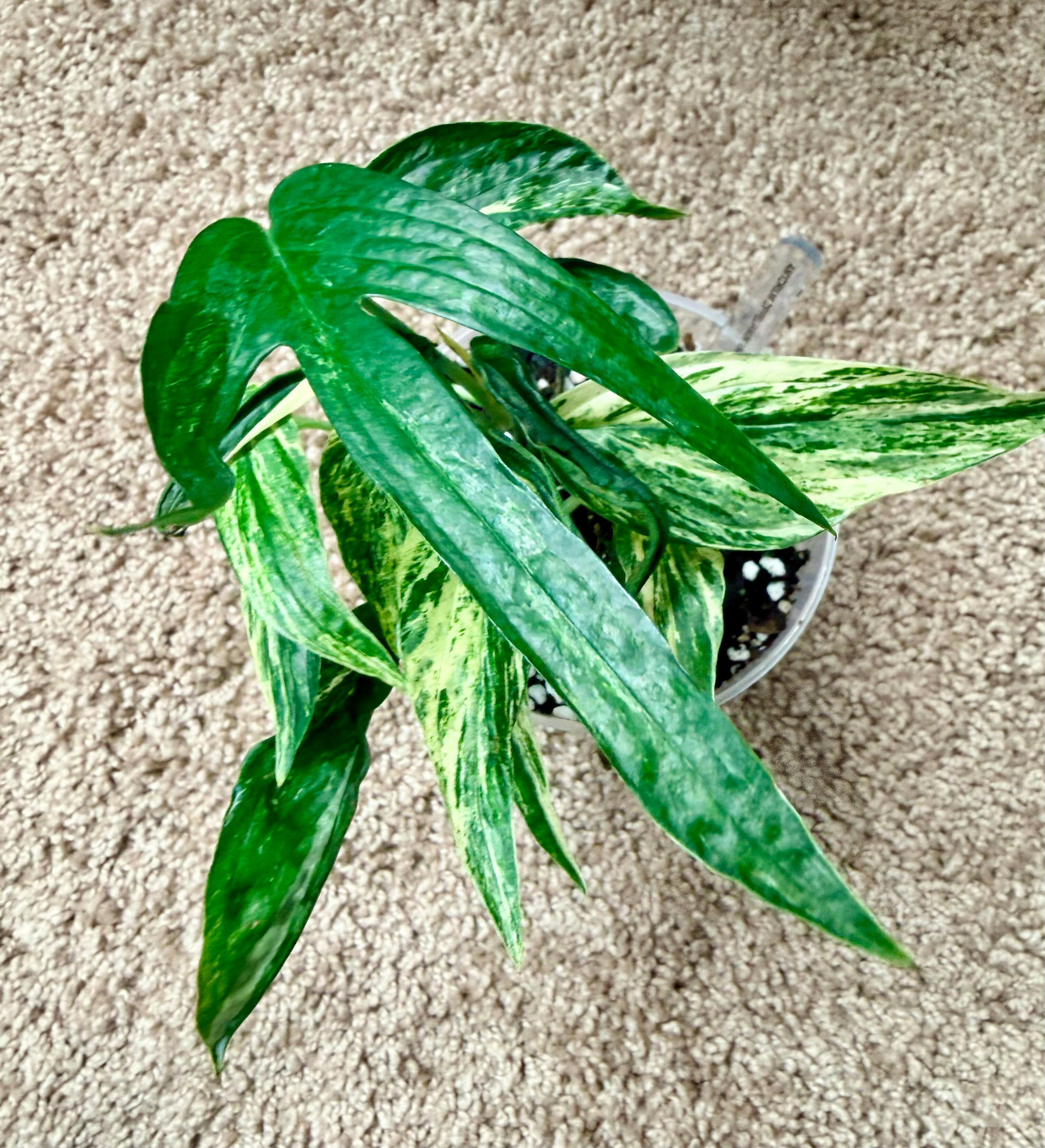 Amydrium zippelianum variegated is a distinctive aroid known for its foliage that closely resembles the leaves of many different types of Monstera and Rhaphidophora plants.