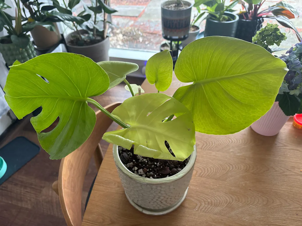 Monstera deliciosa 'Lemon Lime', commonly referred to as the "Swiss Cheese Plant", is a very common indoor plant. This specific cultviar, 'Lemon Lime', has stunning neon green leaves! As the plant matures the leaves will develop fenestrations (or splits).