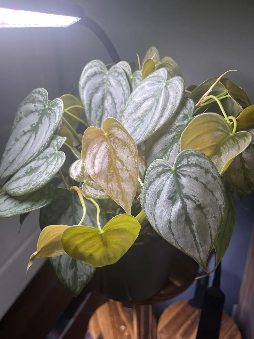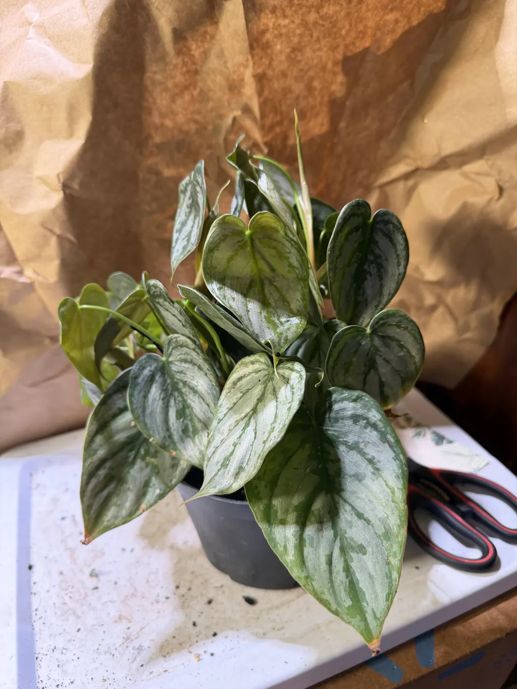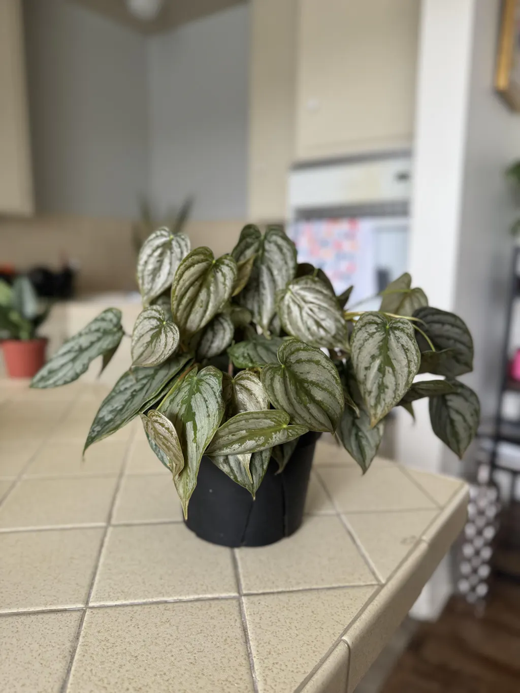 Beautiful shimmer to the leaves. I love the color and texture. Plant is healthy and growing like a beast! If you want a plant wall or jungle effect, don’t forget the Brandtianum!