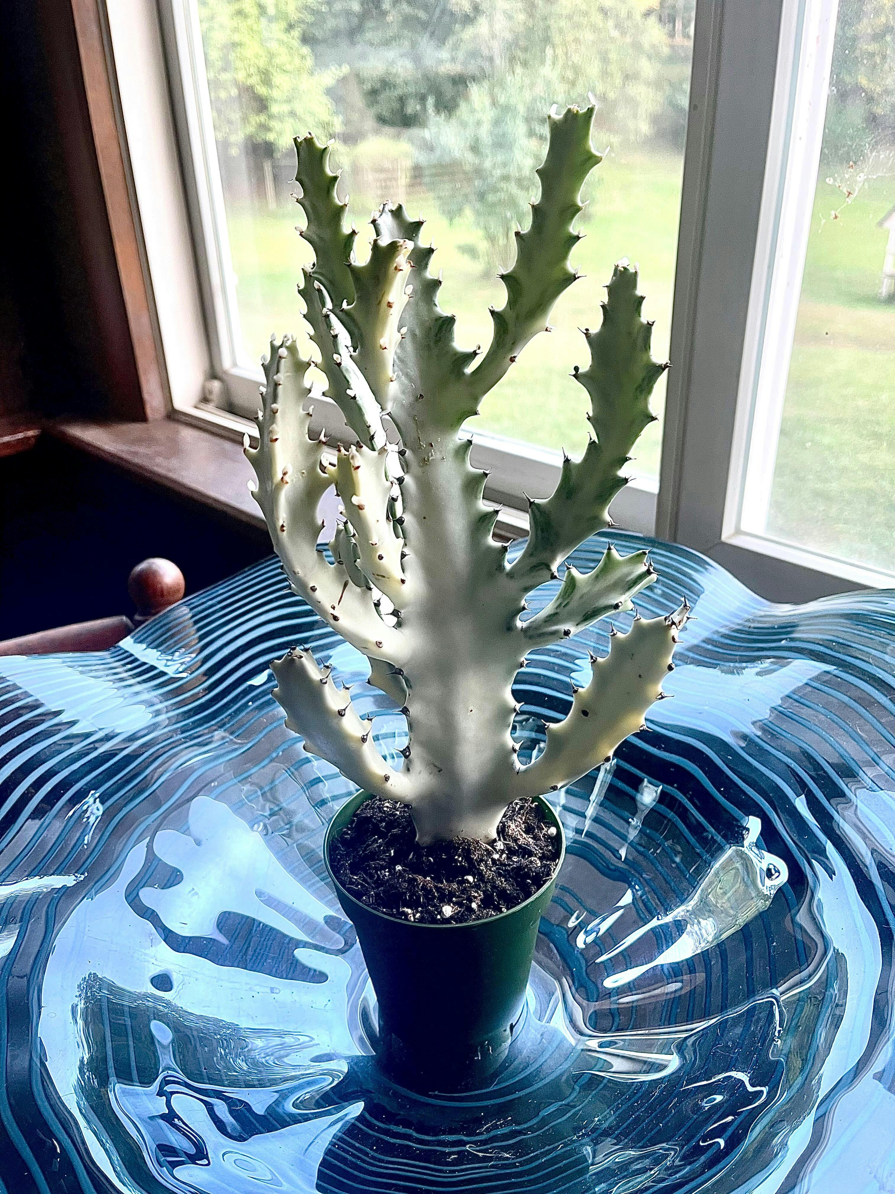 This plant prefers a very well draining soil that is rich in organic matter. Allow your Euphorbia lactea 'Ghost Cactus' to dry out completely before watering, taking care to never allow it to sit in excess water for an extended period. Provide your plant with very bright indirect light for optimal growth. This species will thrive in some morning bright direct light!