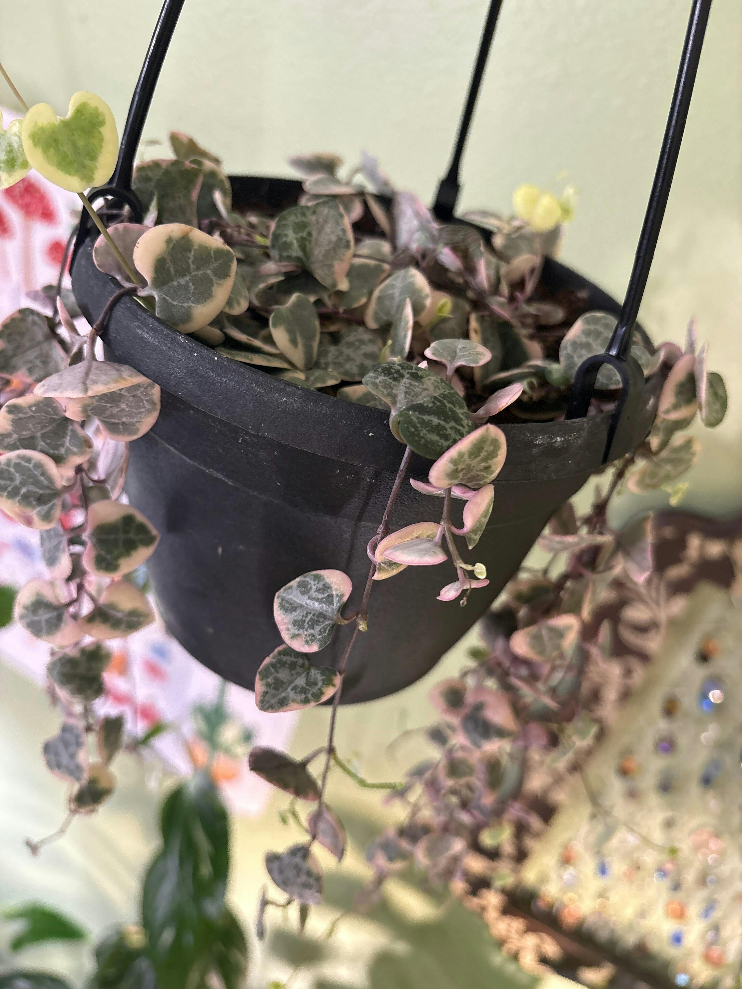 String of Hearts (Ceropegia woodii) is a very sought after trailing indoor plant with cute heart shaped leaves. This plant is semi-succulent so it needs very little attention. This is the variegated cultivar that has white, pink and green foliage.