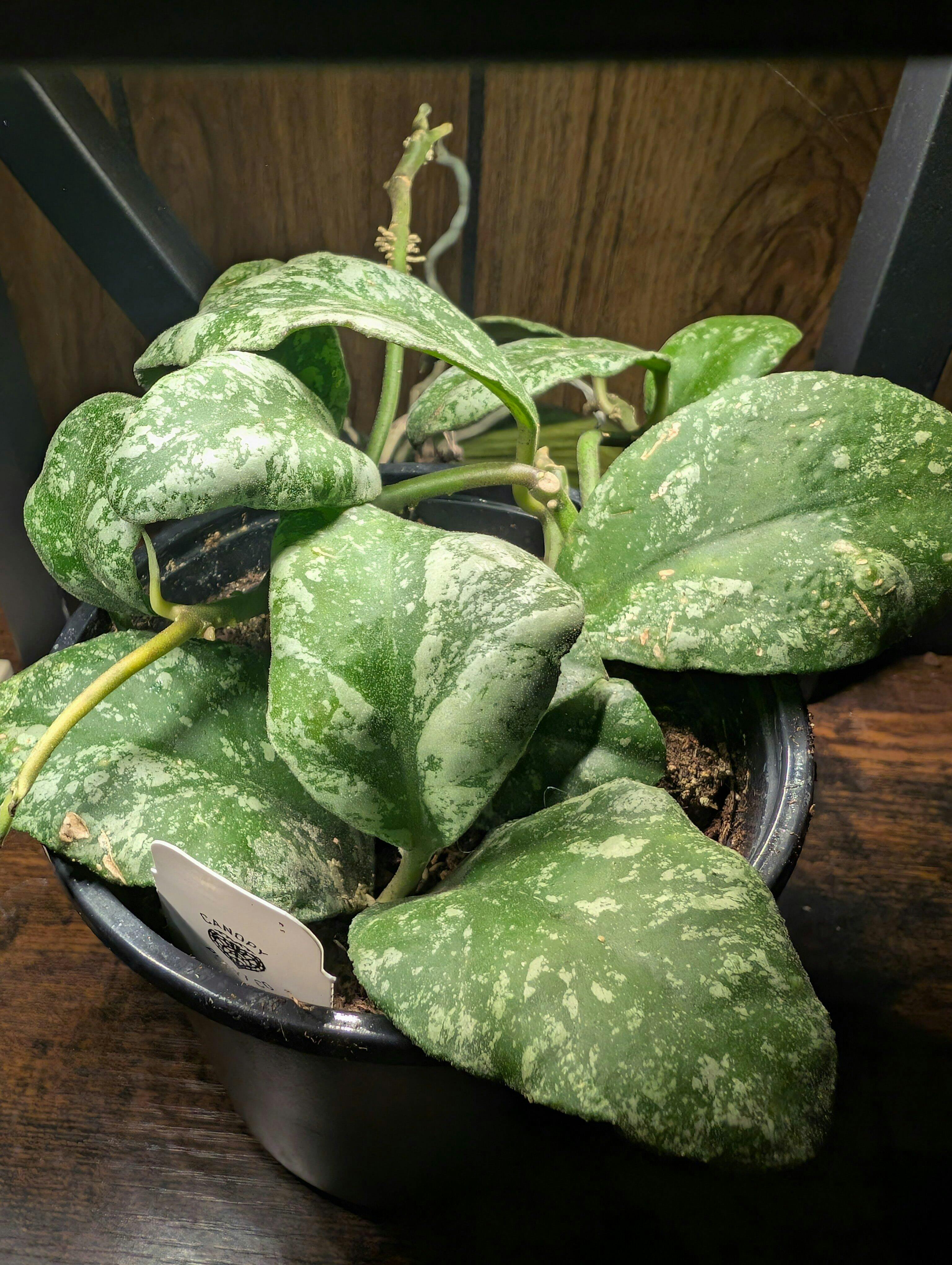 Hoya waymaniae 'Cloudy Sky' is an easy to care for indoor vining plant.  This Hoya has small to medium sized round/oblong shaped leaves with splashes of silver.  If placed in very bright indirect light the leaves will sun stress and turn a beautiful red hue.