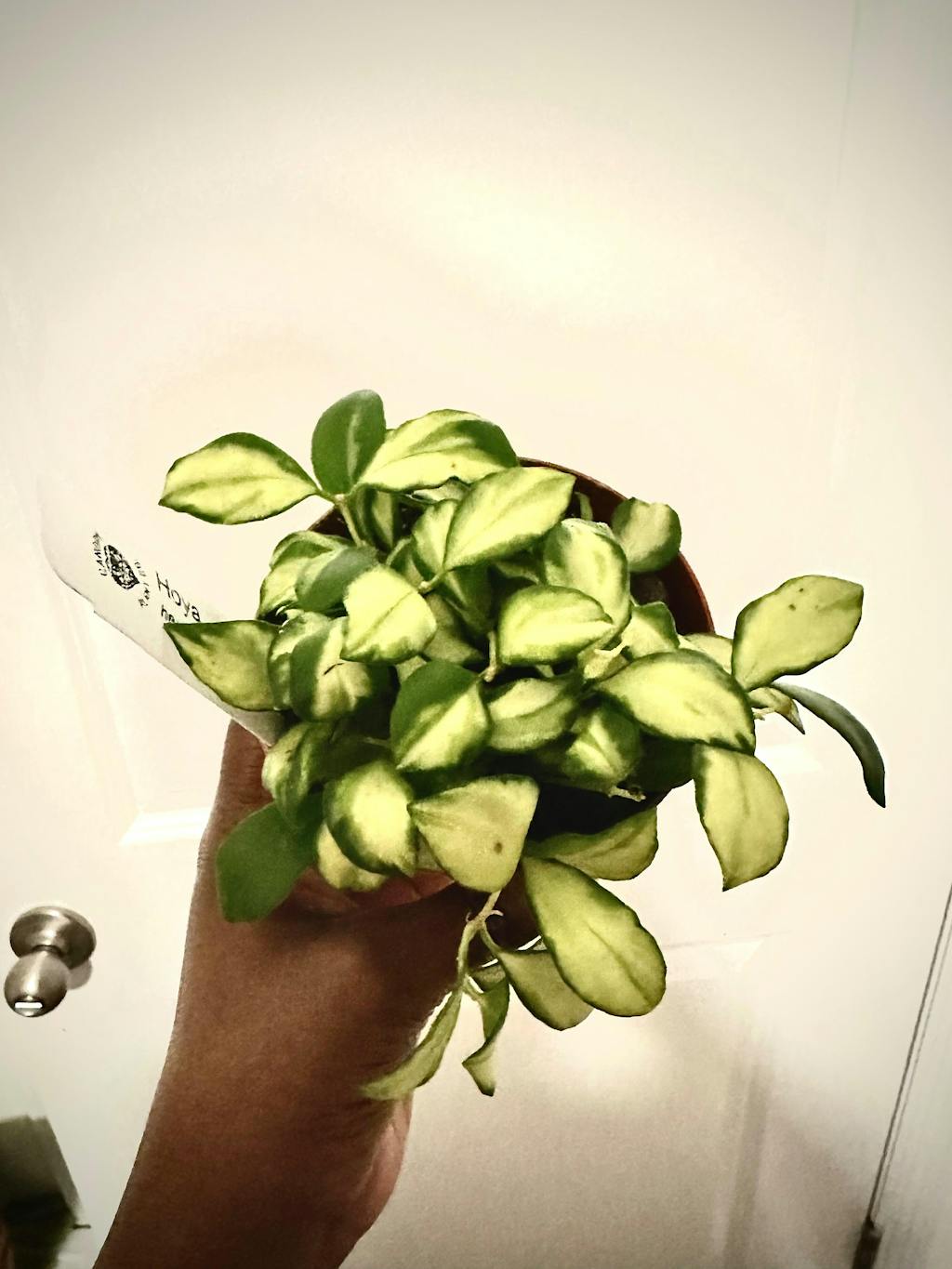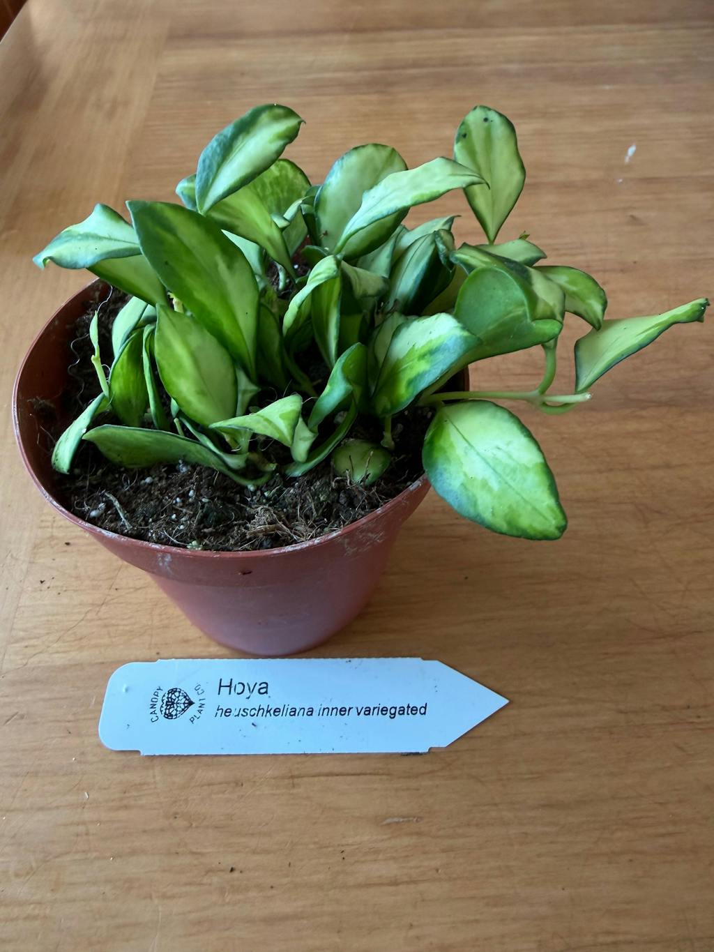 Hoya heuschkeliana variegated has small yellow/white and green variegated leaves. This Hoya is very sought after -- for good reason too! Hoya heuschkeliana can sun stress easily if placed in very bright light!