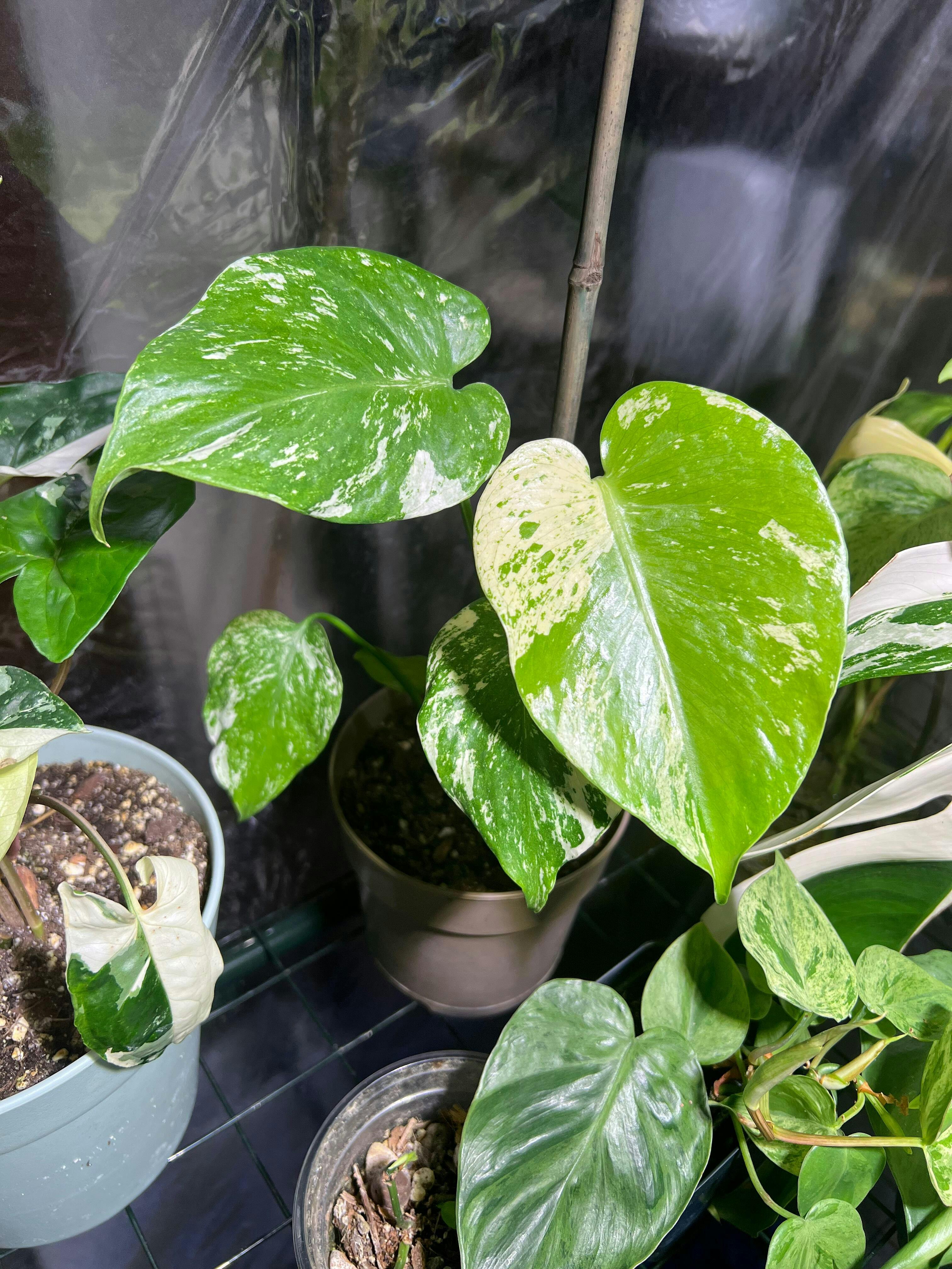 Monstera Mint is a highly sought after variegated form of Monstera deliciosa.  This particular cultivar grows highly speckled white leaves.  A slow grower, but very easy to care for.