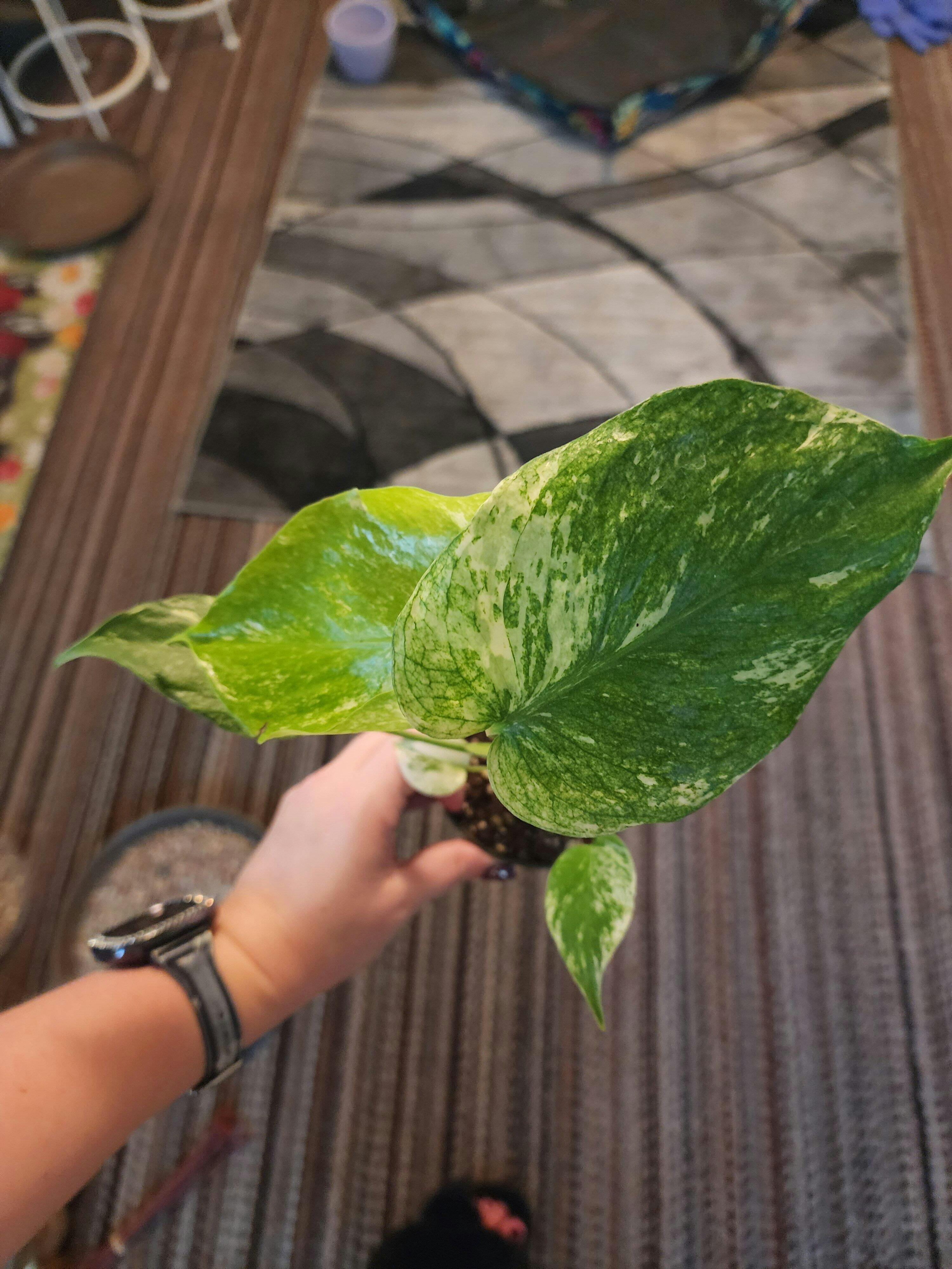 Arrived safely, with roots crawling out of the top of the pot. Her newest leaf has the most variegation yet, and I can’t wait to watch her grow!