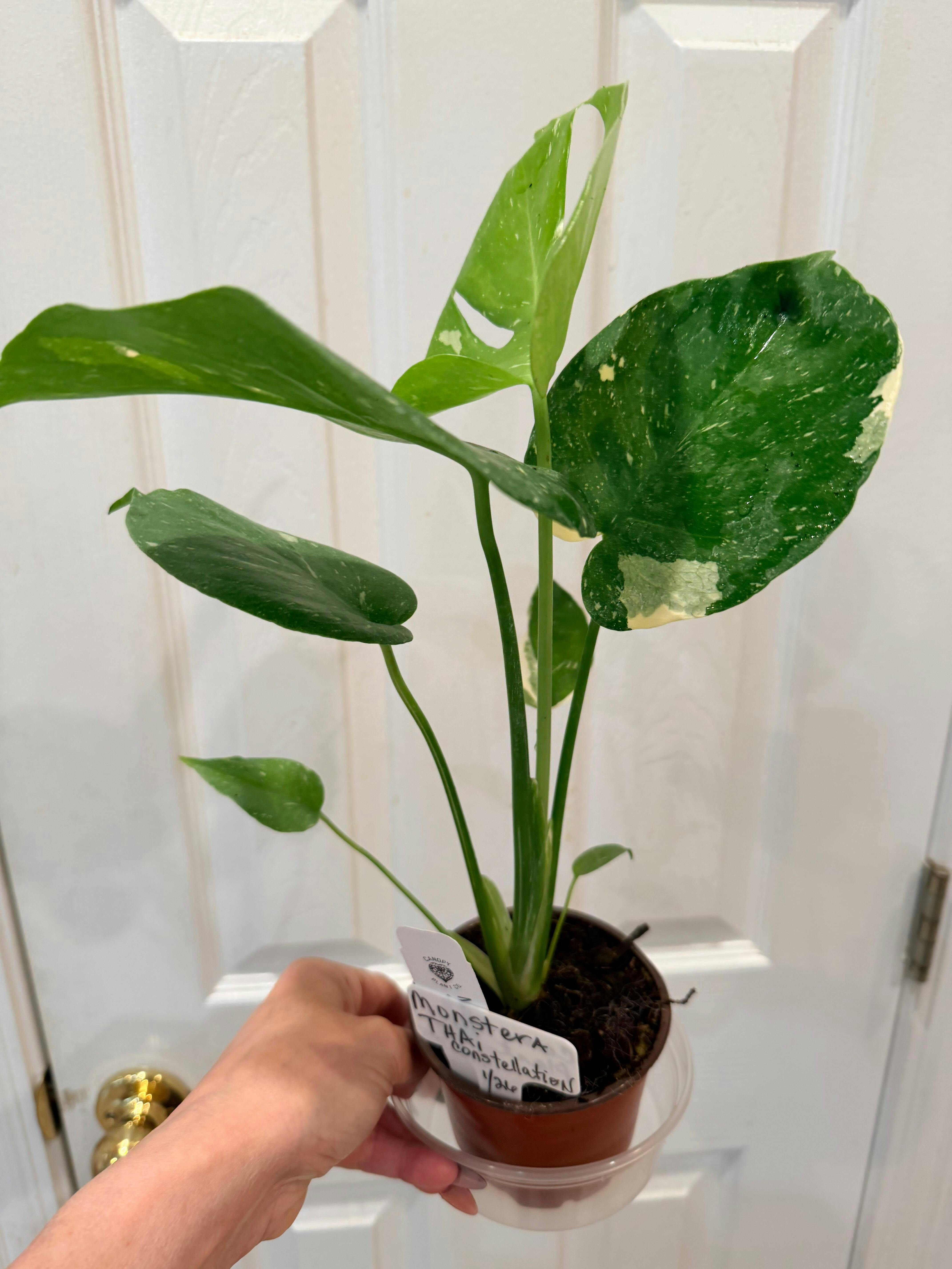 Monstera Thai Constellation is a very popular cultivar of Monstera deliciosa. The foliage on this plant is unlike any other variegated plant! The green leaves have splashes of creamy white variegation.