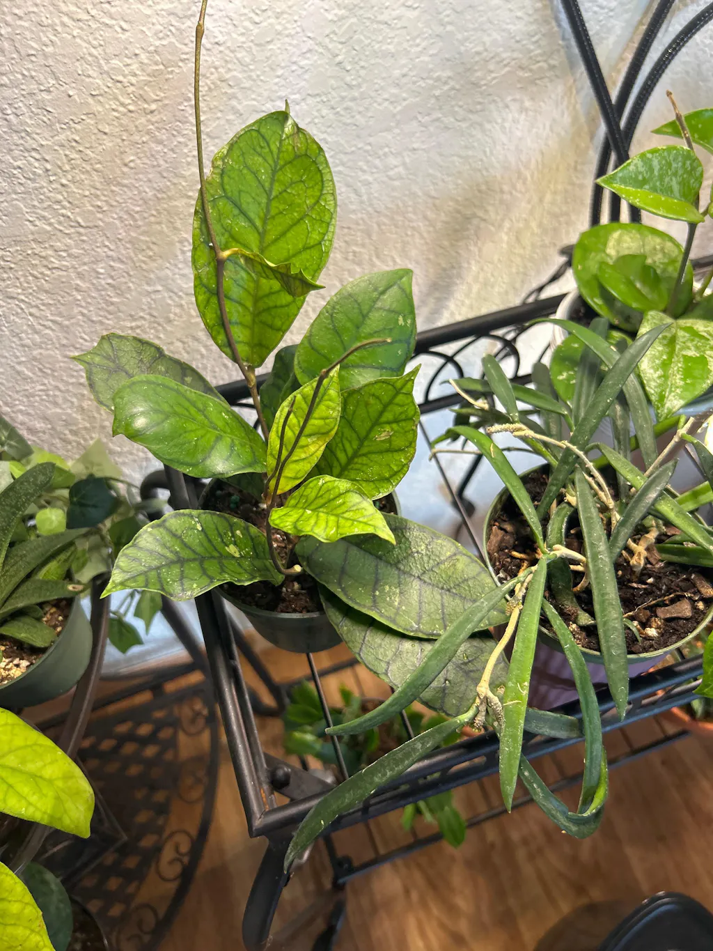 Hoyas have a large range of foliage shapes and textures. They can be found with elongated, deeply veined leaves to thin, narrow leaves and everything in between.