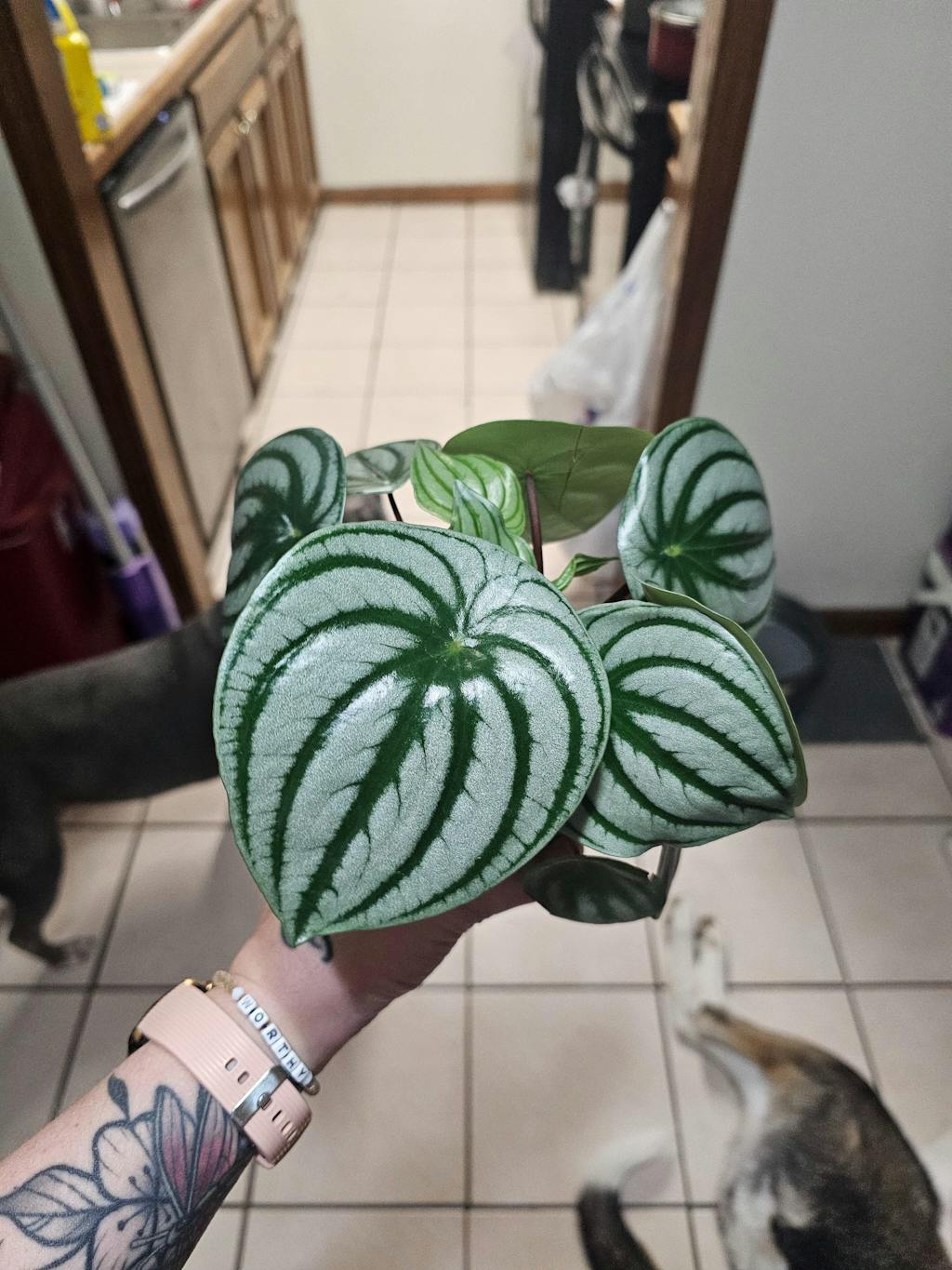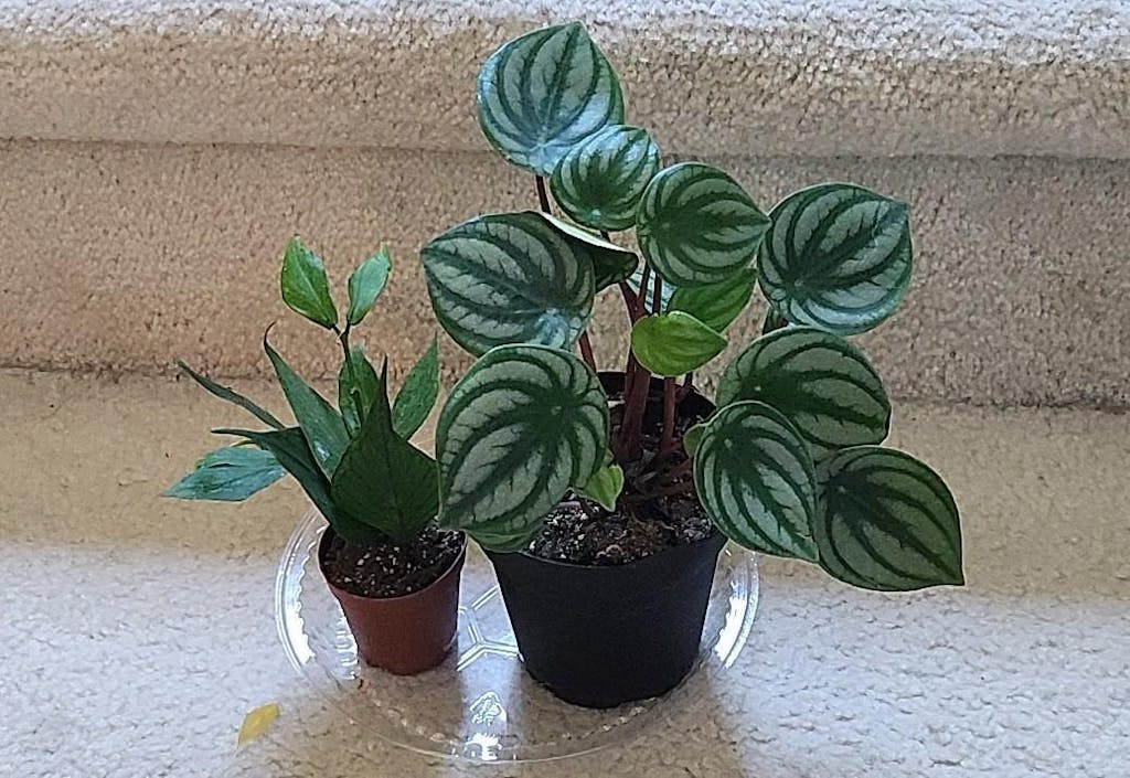 The Peperomia 'Watermelon' plant I received is stunning! I never thought I would own one and it is so wonderful to stare at and see everyday! It makes the room brighter and I love it. Thank you! It was well taken care of, the soil mix is perfect and I can't wait to order more. The plant on the right is the Pereromia, with more leaves than when I got it!