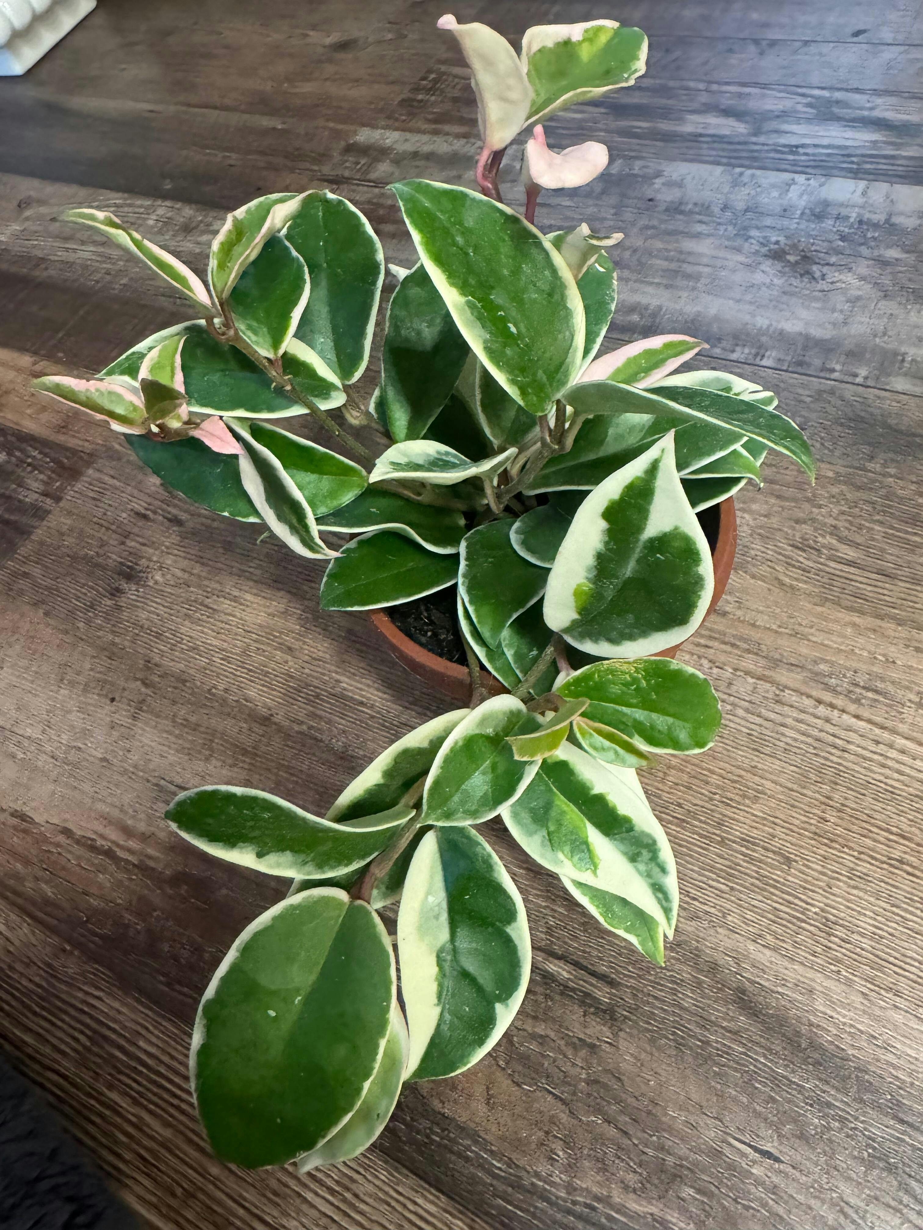 Hoya Krimson Queen is a colorful variegated form of Hoya Carnosa. This species is occasionally confused with Hoya Krimson Princess. The difference between Hoya Krimson Queen and Krimson Princess is that Hoya Krimson Queen has variegation along the leaf margins and Krimson Princess has its variegation on the inside of the leaf margins!