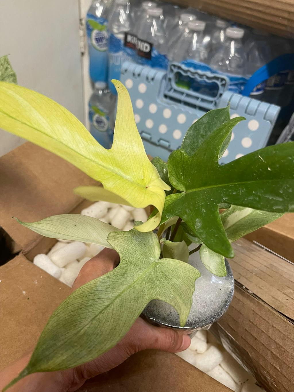 This plant prefers a well draining soil that is rich in organic matter. Allow your plant to dry out almost completely between watering, taking care to not allow it to sit in excess water. Provide it with bright indirect light to ensure that the new emergent leaves continue to appear a white or mint color.