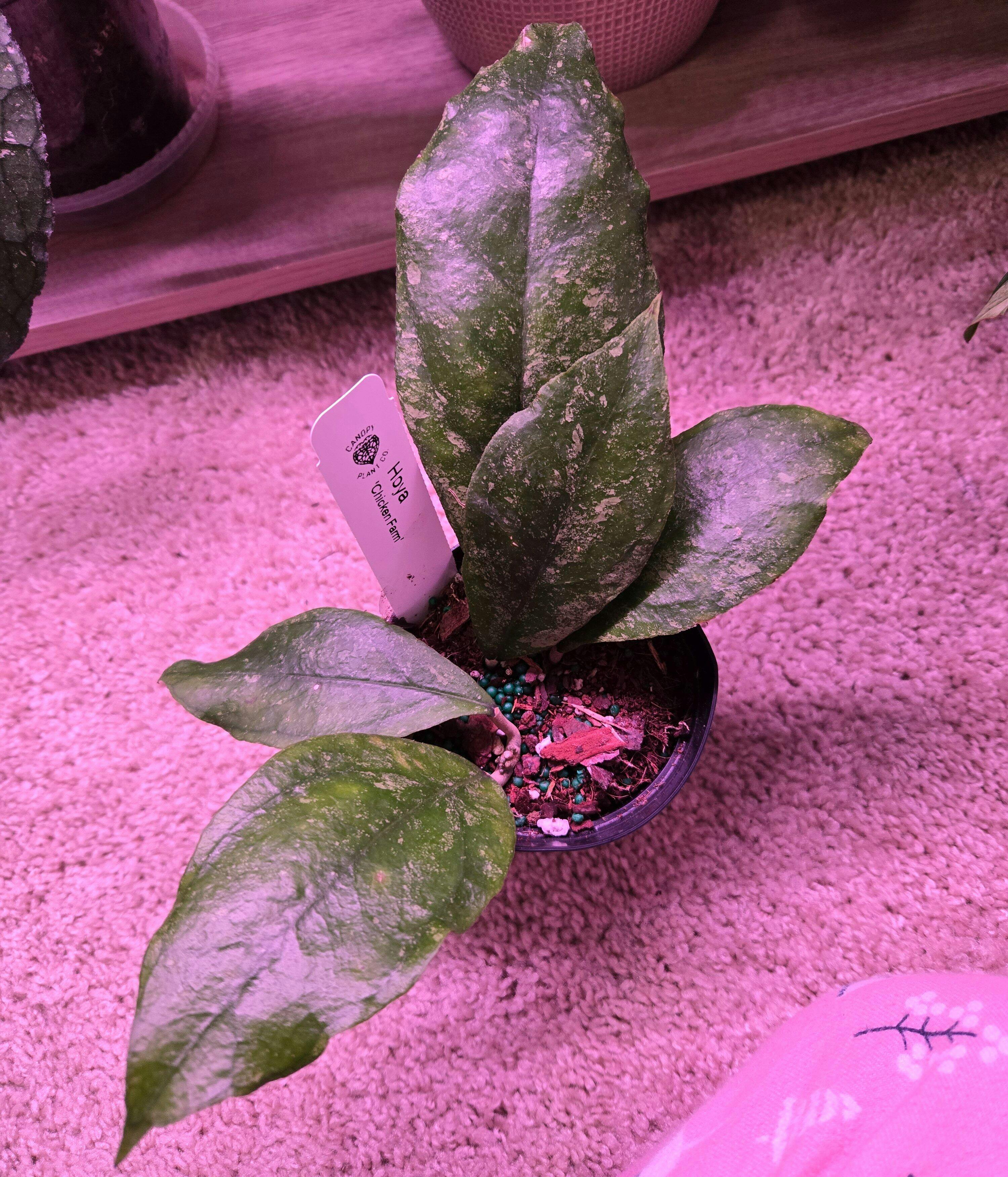 Hoya Chicken Farm is a fairly uncommon variety of Hoya with dark veining and splashes of silver. Commonly known as Wax Plant, Hoyas are easy to grow indoor vining plants that produce beautiful blooms.