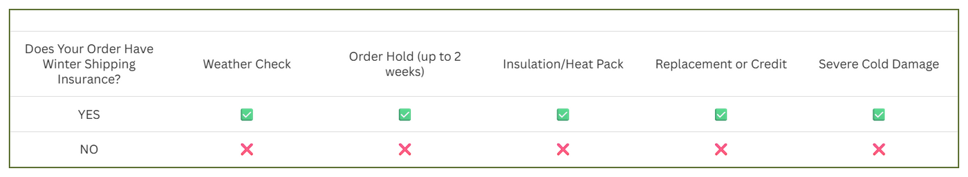 Orders with Winter Shipping Insurance may be held for up to two weeks if weather conditions are unsafe for shipping. This allows us to wait for a safer window and reduce the risk of cold damage during transit.