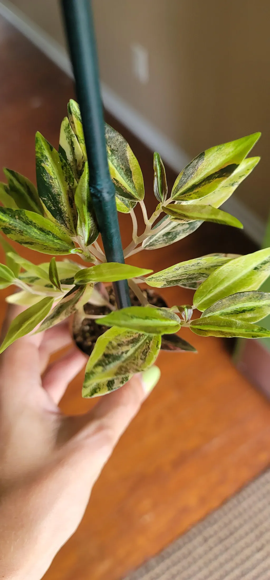 Peperomia metallica variegated 'Harmony’s High Voltage' is a sport of Peperomia metallica that has narrow elongated leaves with colorful variegation. The variegation on this plant varies by leaf and it will keep you on your toes!