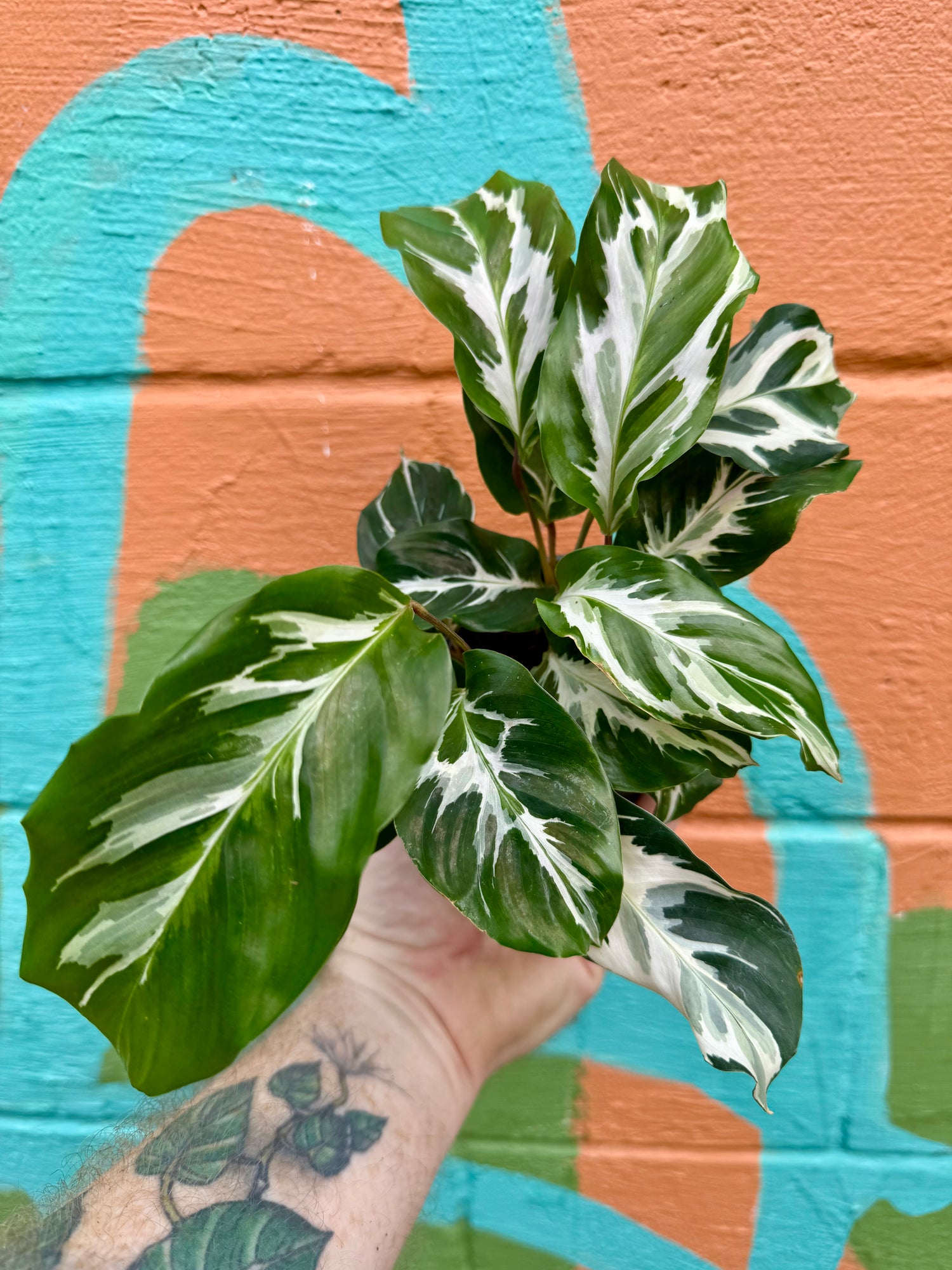 What sets this Calathea plant apart from Calathea 'White Fusion' is that the leaf margins are undulating or ruffled and the variegation is slightly different. Additionally, Calathea Stella leaves tend to grow a bit larger and it can tolerate lower light levels.