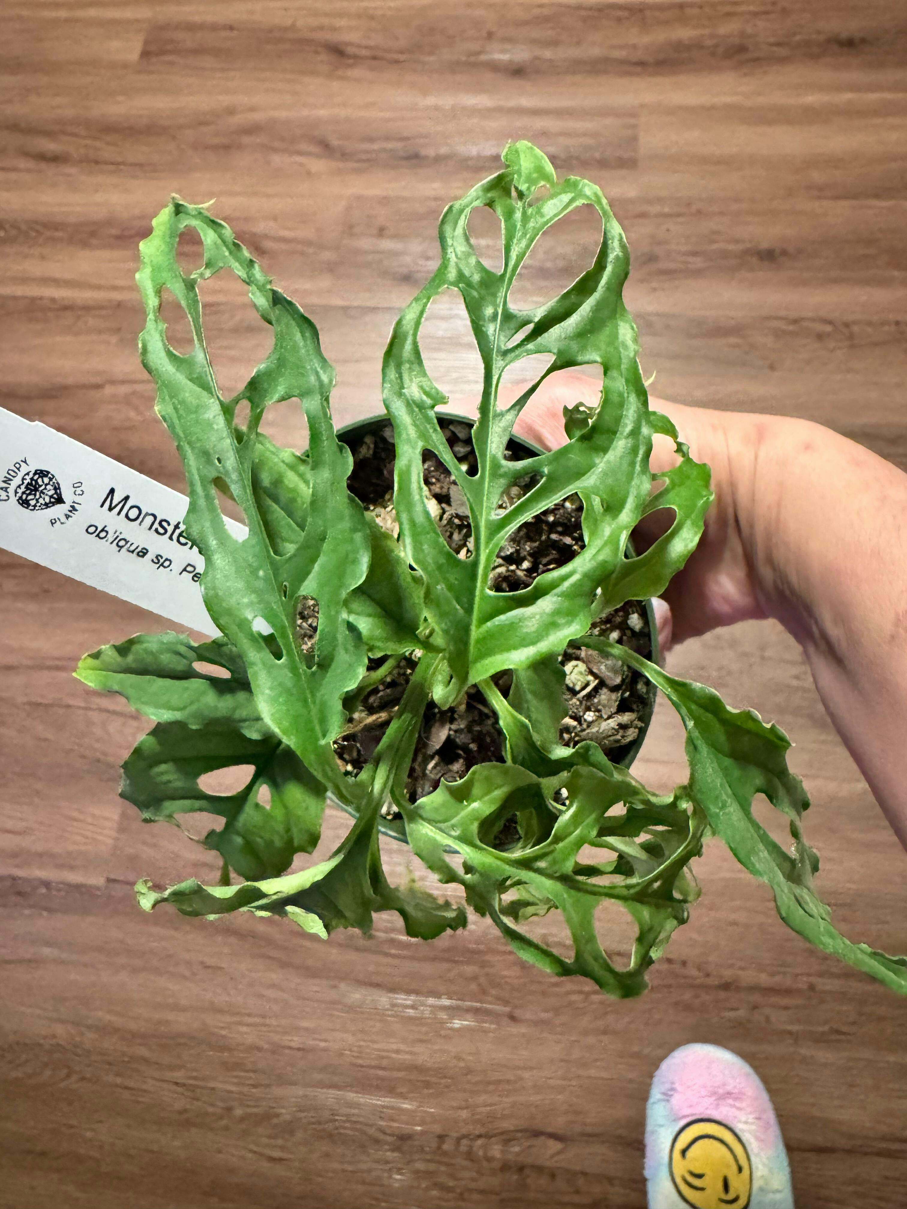This plant prefers a well draining soil that is rich in organic matter. Allow the soil to dry out almost completely before watering, taking care to not allow it to sit in excess water. Monstera obliqua prefers higher than average humidity for optimal growth. Provide your plant with plenty of bright indirect light.