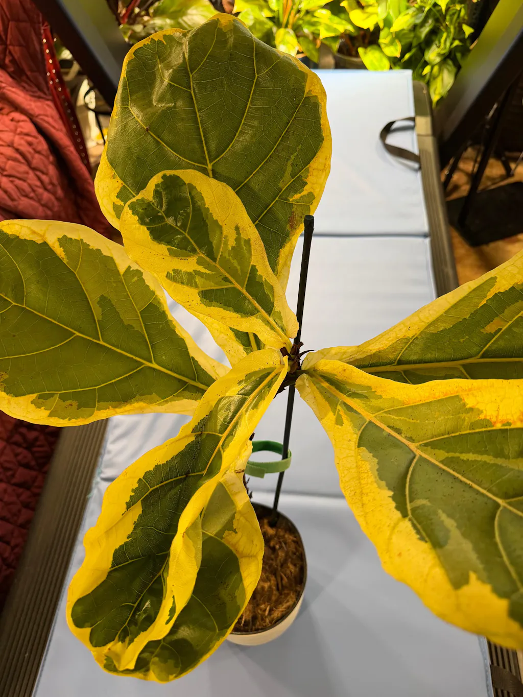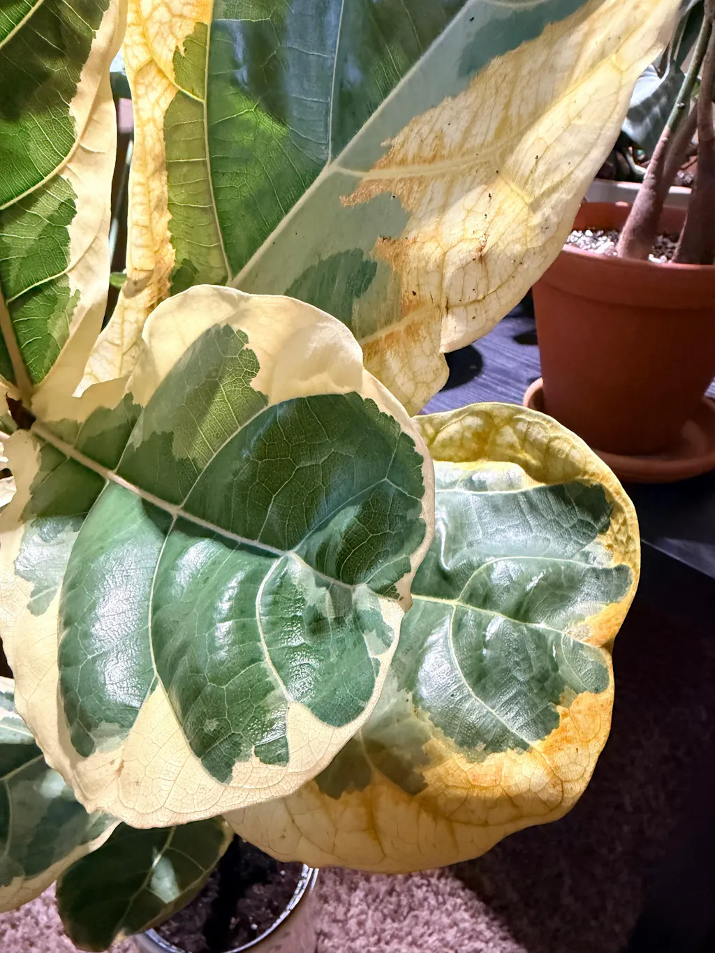 Very large leaves and 2 ft tall. Plant looks very healthy. A little sun stress on the leaves or possible edema? My OG FLF is over 30 years old and we have had our share of stressors. This will be a new adventure in the life of Fiddles!