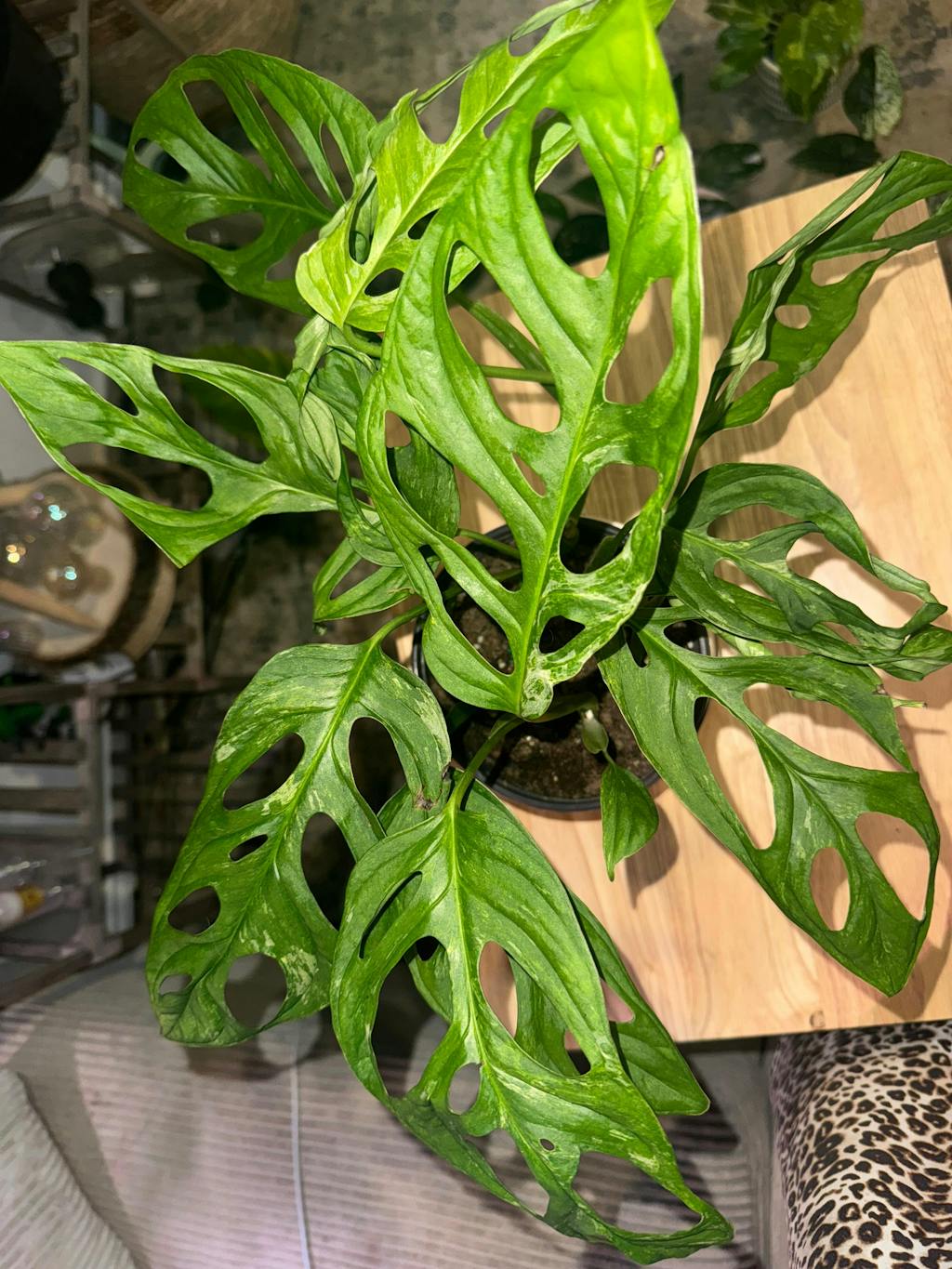 Monstera adansonii variegated 'Mint' is a unique indoor plant. It is a low maintenance beauty with its striking mint variegated leaves and easy care. Perfect for any room needing a touch of nature and a pop of color.