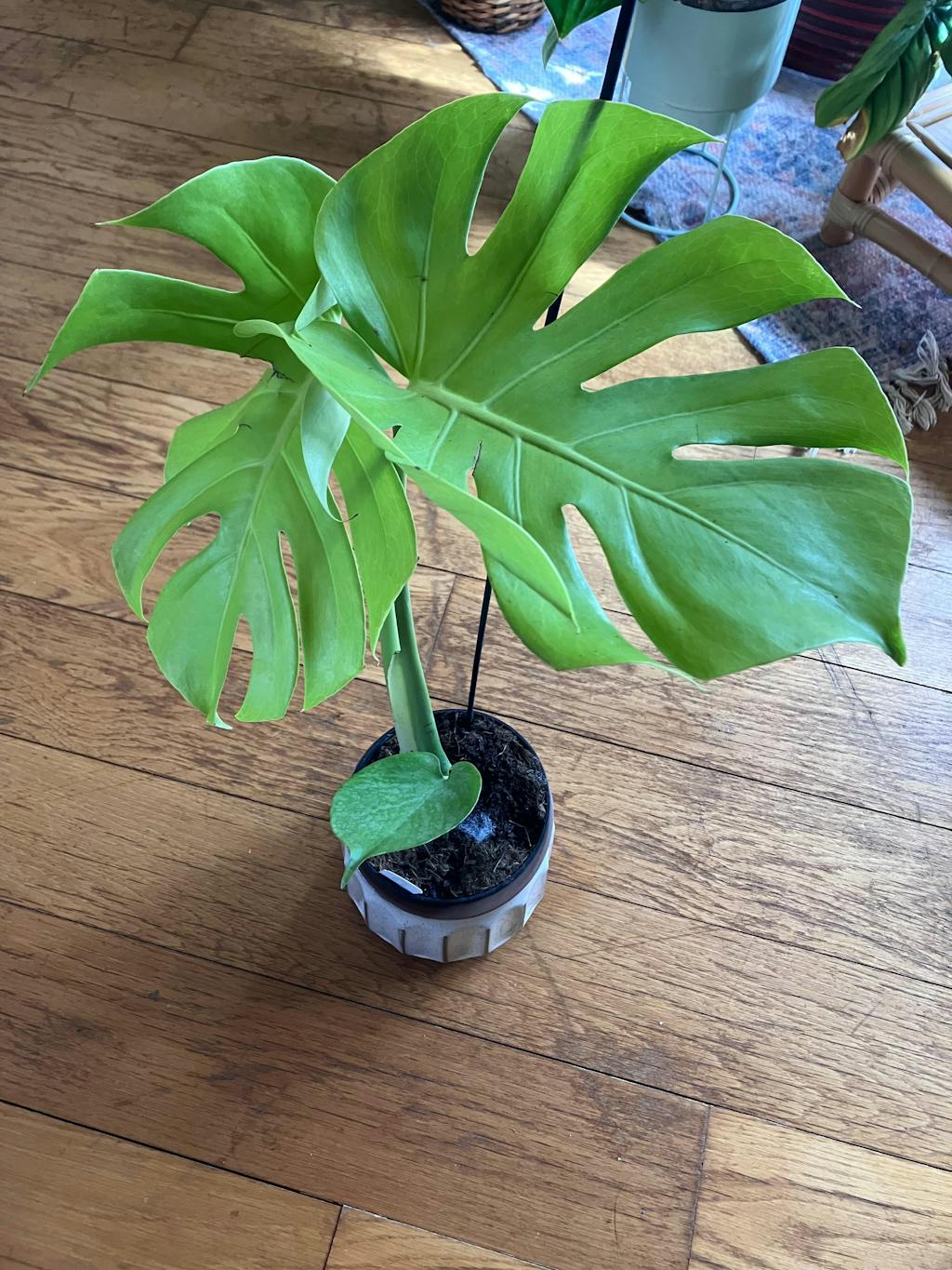Monstera deliciosa 'Lemon Lime', commonly referred to as the "Swiss Cheese Plant", is a very common indoor plant. This specific cultviar, 'Lemon Lime', has stunning neon green leaves! As the plant matures the leaves will develop fenestrations (or splits).